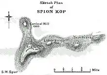 The Battle of Spioen Kop (Dutch: Slag bij Spionkop; Afrikaans: Slag van Spioenkop) was a military engagement between British forces and two Boer Republics, the South African Republic and the Orange Free State, during the campaign by the British to relieve the besieged city Ladysmith during the initial months of the Second Boer War. The battle was fought 23–24 January 1900 on the hilltop of Spioen Kop(1), about 38 km (24 mi) west-southwest of Ladysmith and resulted in a Boer victory.