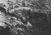 Morale began to sag on both sides as the extreme heat, exhaustion and thirst took hold. On the one hand the Boers on the kop could see large numbers of burghers on the plains below them who refused to join the fight. A sense of betrayal, the bloody failure of the frontal assault, the indiscipline inherent in a civilian army and the apparent security of the British position proved too much for some Boers, who began to abandon their hard-won positions. On the other hand, the bombardment began to take its toll on the British. Woodgate fell at about 08:30, mortally wounded by a shell splinter.[1] In quick succession, Colonel Blomfield of the Lancashire Fusiliers took command but was wounded soon after Woodgate's death, while the sappers' officer, Major H.H.Massy, and Woodgate's brigade major, Captain N.H. Vertue, were killed.[14] Officers and men from different units were intermingled, and the British were now leaderless, confused and pinned down by the heavy Boer artillery and rifle fire. The British artillery, positioned lower down the slopes of Spioen Kop, were unable to hit back at the Boer guns.[1] The British artillery was also missing their marks causing one soldier to remark in his diary of the events "our gunners, by the inaccuracy of their fire did far more damage to our front line of infantry than to the Boers!"[15]