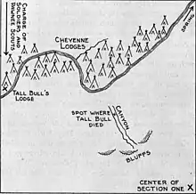 A map of the area where the Battle of Summit Springs took place. Included are the placements of Cheyenne tepees along the stream, the direction from whence came the attack by soldiers and Pawnee scouts, the location of Tall Bull's tepee and place of his death in a canyon, and the bluffs above the canyon.
