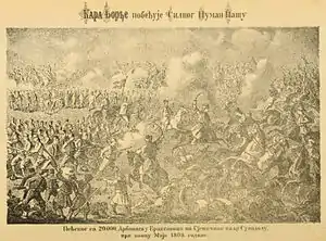 In the spring of 1809, during the Russo-Turkish War (1806–12),[3] the Serbs took up arms once again, and begun directing attacks on Serb-inhabited territories outwards of the former Sanjak of Smederevo.[3] Prior to the Battle of Suvodol, Karađorđe and his forces liberated Nova Varoš and Sjenica and moved onwards towards the river Lim. On 9 June and wary of Köprülüzade Numan Pasha’s forces that were already based in the Suvi Do area, Karađorđe’s forces moved onwards from the river Lim towards Suvi Do. [3] The next day on 10 June, Karađorđe’s forces arrived in Suvi Do from the North West. The exact number of soldiers that were deployed is difficult to attain, with some numbers ranging from 8000 to 20000 Albanian fighters under Köprülüzade Numan Pasha's command and between 4000 and 6000 Serbian fighters under Karađorđe’s command. However, a rough estimate puts Karađorđe’s forces at 4–4,500 troops and an unknown number of cannons. While Köprülüzade Numan Pasha's forces were numbered at 4,000 soldiers with no cannons.[1]