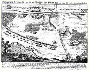 The Battle of Warsaw (German: Schlacht von Warschau; Polish: Bitwa pod Warszawą; Swedish: Tredagarsslaget vid Warschau) took place near Warsaw on July 28–July 30 [O.S. July 18–20] 1656, between the armies of the Polish–Lithuanian Commonwealth and Sweden and Brandenburg. It was a major battle in the Second Northern War between Poland and Sweden in the period 1655–1660, also known as The Deluge. According to Hajo Holborn, it marked "the beginning of Prussian military history".[7]