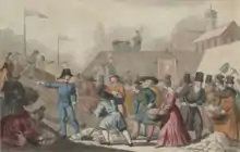 The cholera epidemic struck Warsaw between 16 May and 20 August; 4,734 people fell ill and 2,524 died.[22] On 15 August a riot broke out in the city, with up to 3,000 civilians and soldiers killing suspected spies and traitors.[26] Between 36 and 60 people were killed.[22] Order was restored, but the situation in the besieged city remained fragile.[22][26]