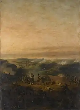 Dugommier sent his divisions forward on the night of 16 November 1794. Augereau advanced on the right flank while Pérignon moved forward in the center, supported by General of Brigade Charles Dugua's cavalry reserve. Sauret and General of Brigade Claude Perrin Victor mounted feint attacks on the left flank.[8] Augereau's attack on the cannon foundry in Sant Llorenç de la Muga and Terrades proved successful, forcing de Courten to pull back his Spanish and French Émigré troops toward Llers. Attacks by Pérignon in the center and Sauret on the left failed in the face of intense Spanish artillery fire from the area of Capmany. A force of Spanish cavalry and infantry under the French royalist Count of Ghent broke through Sauret's line to Cantallops but were driven back with the help of French reinforcements coming from the Pass of Banyuls in the east.[9] On the morning of 18 November, Dugommier, Representative-on-mission Pierre Delbrel, and staff officers watched the combat from the summit of Montroig. The presence of a battery of French guns and the party of French officers drew considerable counter-battery fire from Spanish cannons. About 7:30 AM, an artillery shell exploded nearby and a fragment tore the commanding general's arm off, killing him.[10]