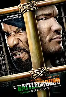 At Money in the Bank, Jinder Mahal defeated Randy Orton to retain the WWE Championship.[9] On the following episode of SmackDown, Orton explained in a sit-down interview that he lost focus after The Singh Brothers (Samir Singh and Sunil Singh) attempted to attack his father, "Cowboy" Bob Orton, who was seated at ringside for the match. He said that he understood having allies, referencing his time in Evolution, The Legacy, and The Authority, but he would not tolerate people disrespecting his family. He said that he was no longer concerned with becoming a fourteen-time world champion; he only wanted to hurt Mahal. Later that night after Mahal defeated Luke Harper, Orton attacked The Singh Brothers, and then Mahal, who escaped into the crowd.[10] The following week, Orton said that he wanted a rematch for the title and that if he did not receive it, he would continue to attack Mahal anywhere he saw him. Commissioner Shane McMahon, who sympathized with Orton over Mahal and The Singh Brothers disrespecting his family, gave Orton a title rematch at Battleground, but allowed Mahal to choose the stipulation. Mahal chose a Punjabi Prison match, made famous by The Great Khali, marking the third Punjabi Prison match in WWE history and the first since 2007.[11] On the July 4 episode, Orton said that he would punish Mahal in the Punjabi Prison.[12] Mahal responded and said that he would be bringing the Punjabi Prison to SmackDown the following week.[13] That episode, while inside of the Punjabi Prison, The Singh Brothers explained the rules of the match while Mahal said that there would be no escape for Orton. Orton then came out and said that since the two of them would be locked in the prison, Mahal would not be able to have help from The Singh Brothers, who were the reason why Mahal won the title and subsequently retained it beforehand.[14]