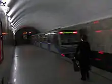 Baumanskaya (Russian: Бауманскаяpronunciation) is a station on the Arbatsko-Pokrovskaya Line of the Moscow Metro, named after the revolutionary Nikolai Bauman. It was designed by Boris Iofan and Yury Zenkevich and opened in 1944. The Art Deco design features white marble pylons with rounded corners, projecting, fluted piers faced with red ceramic tile, and decorative ventilation grilles. In the bays between each set of piers are bronze sculptures by V.A. Andreev depicting Russian soldiers and workers of the home front during World War II. At the end of the platform is a mosaic portrait of Vladimir Lenin. This station is very busy, as one of the biggest Moscow institutes (Moscow State Technical University) is located not far away.