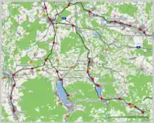 The three BOB lines run on part of what was the Bayerischen Maximiliansbahn as a combined train-set from München Hauptbahnhof via the southern ring to Holzkirchen. In Holzkirchen the combined train-set separates with one train-set heading off to the east, running through Miesbach and Schliersee to Bayrischzell.