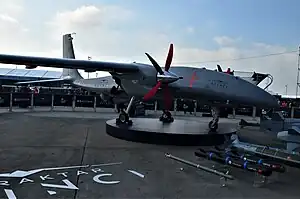 The aircraft has a 5.5+ ton maximum takeoff weight (MTOW), of which over 1,350 kg (2,980 lb) is payload. Akıncı is equipped with two turboprop engines of either 450 hp (460 PS; 340 kW) or 750 hp (760 PS; 560 kW), as well as electronic support and ECM systems, dual satellite communication systems, air-to-air radar, collision avoidance radar, and advanced synthetic-aperture radar.[3]