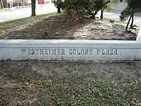 At the crossroads where Westheimer becomes Elgin in Midtown Houston, there is a small plaza where northbound Spur 527 becomes Brazos Street. Sandwiched between Brazos and Bagby, the plaza is known as the Westheimer Colony Plaza.