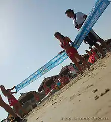 Beach golf was created in Pescara, Italy in 1999 by Mauro De Marco.[1] It was designed to be played on crowded beaches during the summer. Objects on the beach are incorporated into the game. Beach umbrellas, bathing people and other objects are turned into obstacles of the game. The rules allow the audience to interact with participants.