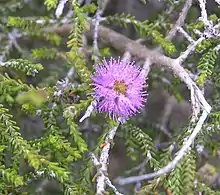 The flowers are pink to purplish red and are arranged in heads about 20 mm (0.8 in) in diameter, on the ends of branches which continue to grow after flowering. The flowers have 5 sepals, 5 petals and 5 bundles of stamens with usually three to five stamens each. The stamens bundles are hairy and joined for 1.5–5 mm (0.06–0.2 in) of their length with the free parts a further 2.5–5 mm (0.1–0.2 in) long. Flowering can occur in almost any month, depending on the weather and is followed by fruits which are woody capsules. The capsules are 6.5–11.5 mm (0.3–0.5 in) long and 5–6 mm (0.20–0.24 in) wide and often joined together.[2][3]