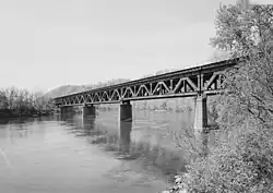 The Beaver River Railroad Bridge crosses the Beaver River in New Brighton, Pennsylvania, carrying the tracks of the Fort Wayne Line. It was built in 1926, to a design by J.F. Leonard, the Pennsylvania Railroad's engineer in charge of bridges and buildings, for the Pittsburgh, Fort Wayne and Chicago Railway. The riveted Warren deck truss main span and riveted deck girder western side spans have a total length of 1,221 feet (372 m). The deck truss spans vary from 122 feet (37 m) to 219 feet (67 m), some of which are unusually shallow and skewed. It replaced an 1887 span, which was converted to road use, continuing in that role until it was replaced in 1985.[1]