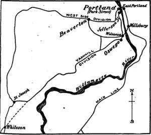 ![]() Map showing the Southern Pacific lines in Portland circa 1910. The Beaverton cut-off runs from Beaverton to Willsburg via Oswego. | |