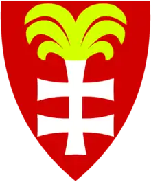 The coat of arms of the Bebek family is formed by the silver patriarchal cross, which is placed in the red early Gothic shield. On the top of the cross are placed golden bird feathers. The coat of arms of the Bebek family was evolving and different variants of it exist. On some depictions bars of cross have same length, on some depictions lower bar is longer. Usage of silver patriarchal cross, symbol of ruling Arpád family testifies about close relations to the ruling Árpád dynasty. Heraldic crest of the family is a crowned girl with two fish, which is interpreted as Melusine.[5]