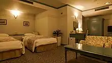 Two beds with brown bed skirts.