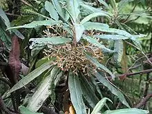 The young branches and lower surface of leaves and the whorl that surrounds the flower heads are densely covered with short matted and stellate hairs.[2]