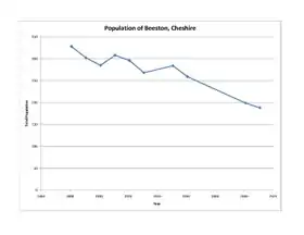 The overall trend for in Beeston has been that the population has reduced since the 1881 census, with approximately 188 people living in the village in 2011.[7] This is despite the overall number of households in the parish increasing.[8]