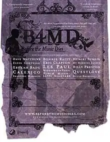 Before the Music Dies (B4MD) is a 2006 U.S. documentary film that criticizes the American music industry and the increasing commercialization of the art of music over the past thirty years. The film features interviews and performances from such musicians and groups as Doyle Bramhall II, Erykah Badu, Eric Clapton, Dave Matthews, Branford Marsalis, Elvis Costello, Bonnie Raitt and My Morning Jacket.[1] It was directed by Andrew Shapter, produced by Joel Rasmussen, and co-written by Shapter and Rasmussen.[2] The film premiered on March 12, 2006, at the South by Southwest film festival in Austin, Texas.[3]