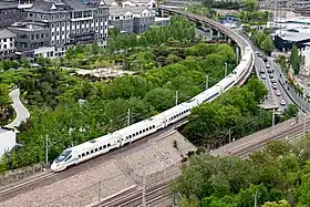 The rail starts at Baiziwan station on the southeast ring railway, crosses the Beijing–Harbin railway and Tonghui river to the north, turns to the west of Wangjing, and connects with the Beijing–Baotou line 27.850 kilometers (17.305 mi) between Qinghe and Shahe Station, with a total length of 36 kilometers (22 mi). The line was designed by the China Railway Third Design Institute and constructed by the Beijing Railway Bureau. Construction began on January 13, 1960, and in 1961 the track was laid to the north of Xinghuo. In 1961, the construction of Baiziwan was suspended due to the difficulty of relocation and land purchasing. Construction resumed in 1966. By an original industrial railway connecting Beijing East station, the temporary transition rail line opened on December 10, 1968.[1] Train services officially began in January 1972.[2] The whole construction of railway overpasses among Baziwan, Shuangqiao, Beijing East and Xinghuo finished on December 4, 1987.[1]