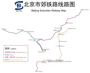 BCR (Beijing City Rail) also known as Beijing Suburban Railway is a commuter rail service that connects urban Beijing with outlying districts beyond the reach of the city's Beijing Subway network. The suburban rail services run on existing China Railway lines.