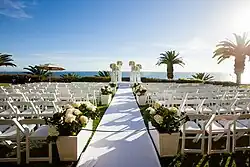 Bel-Air Bay Club is a Southern California, 1920's Mediterranean style mansion with various gardens and an ocean view.[3] The venue's cliffside lawn with the ocean view is one of the common locations where couples choose to hold their wedding ceremonies. An outdoor Spanish-style courtyard patio is commonly used for receptions because of its fountain, fireplace, and lights. The venue's luxury-style Living Room is also commonly used for receptions and event gatherings.