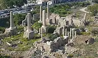 Descriptions of the temple in the mid-19th century describe the remains of 16 columns,[2] with 10 still standing in 1852, of which four on the east and three on the northwest still held architraves with Doric-style capitals.[4] In 1858 when Van de Velde visited, only nine of the columns were still standing.[5] In 1877 when H. H. Kitchener visited, only six columns still bore an architrave.[6]