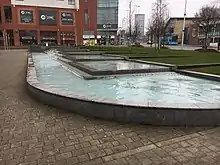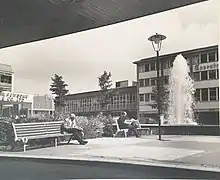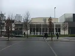 The Coventry City Architect's Department under Donald Gibson produced a model in 1944 that showed three interlinked theatres and cinemas arranged radially around a quarter circle shaped car park, centred roughly on the site of the Belgrade.[28] Through the late 1940s and early 1950s it became increasingly clear that only one theatre was needed, so Arthur Ling began work on the building that stands there today. The south east elevation is reminiscent of Gibson's Broadgate House (1948–53) with an arcade of shopfronts underneath a brick-clad block of flats for visiting actors, with regular square windows framed with pale stone.[29] Ling departed from Gibson's theme for the rest of the building though, with its north east flank of Portland stone and glass.[30] The north east elevation faces Belgrade Square, an open area with a fountain and some green space. When originally built the theatre had a covered entrance for people arriving in vehicles, which has since been removed.[31]