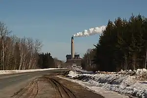 The plant itself features a single boiler and a single 169 meter (554 ft) tall smokestack.[2] The plant was the first in Canada to install scrubbers to help reduce sulphur dioxide emissions; it also has an electrostatic precipitator that removes over 99% of particles in the flue gases, as well as special burners to limit nitrogen oxide emissions. The plant was designed to accommodate construction of a parallel second generating station (phase II) should one be built. An upgrade began in July 2004 which saw a Titan ProAsh facility built to recapture 75% of fly ash produced by the generating station. This has resulted in production of a synthetic gypsum byproduct which is sold by NB Power to J.D. Irving Limited for production into wallboard.