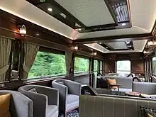 The Grand Hibernian carriages were heavily renovated Mark 3s, originally built by British Rail Engineering Limited at Derby Litchurch Lane Works for Córas Iompair Éireann between 1980 and 1989, and withdrawn in 2009. The carriages underwent extensive engineering redesign and overhaul by Assenta Rail and were refurbished by the company in 2015 at a cost of £7 million.[2] Internal fitting was carried out in Antrim, by Mivan. From the eleven Mark 3 carriages purchased,[2] the train included five sleeping cars, two restaurant cars for dining and an observation car. The train composition and the carriage layouts were inspired by Belmond's other overnight luxury train on the British Islands: the Royal Scotsman. Carriage names were based on the counties of Ireland, several taken from each of the provinces of Ireland. Each carriage bore a dark blue livery, 'Grand Hibernian' lettering, an enamel nameplate, and a 'Celtic knot' logo.[3]