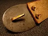 Belt buckles go back at least to the Iron Age and a gold "great buckle" was among the items interred at Sutton Hoo. Primarily decorative "shield on tongue" buckles were common Anglo-Saxon grave goods at this time, elaborately decorated on the "shield" portion and associated only with men. One such buckle, found in a 7th-century grave at Finglesham, Kent during excavations by Sonia Chadwick Hawkes in 1964 bears the image of a naked warrior standing between two spears wearing only a horned helmet and belt.[1]