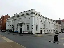 The chapel on Belvoir Street in Leicester City Centre was designed by Joseph Hansom and built in 1845. It was sometimes called the 'Pork Pie Chapel' on account of its resemblance to a pork pie.[1][8] It became a Grade II listed building (1361372) on 5 January 1950.[9] The building was sold in 1947 after the congregation had united with that of the Charles Street Chapel. Renamed for its architect, it is used for adult education[1] as part of the Leicester Vaughan College.[10]