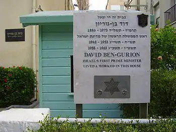 The Ben-Gurion House is a historic house museum in Tel Aviv, which served as the family home of pre-State Zionist leader and then first Defense and Prime Minister of Israel, David Ben-Gurion, between 1931 and 1953. Until his death in 1973, it continued serving as an additional residence, along with two others, one private – "Ben-Gurion's hut" at Kibbutz Sde Boker in the Negev (known as his desert home), and the official residence as Prime Minister of Israel during his multiple terms as head of government.[1] The latter, known as Julius Jacobs House, is located in Rehavia, Jerusalem.