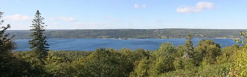The Ben Eoin Trail (1.7 kilometres (1.1 mi) return) starts at the Ben Eoin Provincial Picnic Park. A hiker's sign indicates the trailhead in the park. A very nice steady hike that climbs along a well-worn path. It climbs uphill through large and old Birch and Beech Trees. The trail leads to a well cleared look-off of solid ground and large flat stone on a ridge of the East Bay Hills with a panoramic view of the East Bay of the Bras d'Or Lake 165 metres (541 ft) below.[7]