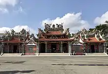 In 1998, worshippers bought a tract of land directly adjacent to Shuixian Temple to rebuild Tianhou Temple. The new temple measured 420 ping and took five years to complete.[1] The temple was built using traditional methods: notably, the carpenter was the son of the carpenter that helped renovate Shuixian Temple.[5] On 10 October 2002, a ceremony was held to move the Mazu statue from Shuixian Temple, and future pilgrimages from Nanyao Temple ended at the new Tianhou Temple.[1][4]