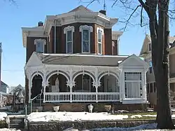 Featuring an unusually detailed Stick-Eastlake brick facade, the Coppess House is a T-shaped building that is supported by a stone foundation;[2] the roof is asphalt, and minor elements of stone are also visible.[3] A large enclosed porch and a veranda wrap around the "lower" portion of the "T", which faces the street, while above and behind the porch, placed at the base of the "T", sits a large bay window. The porch is among the most significant components of the building, due to elements such as exquisitely detailed arches formed of tiny spindles, which sprout from columns meant to resemble massive table legs;[2] one must walk under one such arch to use the porch's main entrance, located on one of its corners, and three more such arches are placed on the front and on the side to either side of the entrance.[3] Small gables are placed over the porch's main entrance and a subsidiary one, decorated with small sculptures, both carven and molded.[2]