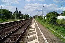 Bensheim-Auerbach station is a station on the Main-Neckar Railway in the Bensheim district of Auerbach on the Mountain Road in the German state of Hesse. It has a heritage-listed entrance building. The station is classified by Deutsche Bahn (DB) as a category 5 station.[1] Only Regionalbahn services stop at the 3 platform tracks (only tracks 1 and 2 are used regularly).
