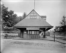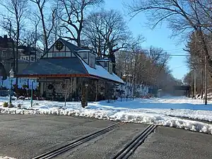 The station was constructed in 1883 in a unique English Tudor design with stucco facades and a slate roof[6] as part of the New York and Greenwood Lake Railway, an Erie Railroad operation, and was known as Glenwood. It had a two platform, two track station with the gas lights on the side of tracks.[7] It later became a stop on New Jersey Transit Rail Operations Boonton Line, which runs from Hoboken Terminal to Hackettstown, and renamed Benson Street. Service was discontinued to Benson Street (along with Rowe Street in Bloomfield and Arlington in Kearny) on September 20, 2002[5] when the Montclair Connection was opened.[8] Glen Ridge is serviced to the south at Glen Ridge station in the downtown commercial district.