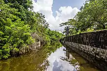 The pentagon-shaped Benteng Pendem covers a total of 10.5 hectares (26 acres), though 4 hectares (9.9 acres) have been used for the oil storage facilities. On site is an excavated moat, 500 metres (1,600 ft) long, 5 metres (16 ft) wide by 2–3 metres (6 ft 7 in – 9 ft 10 in) deep. Originally, the moat had been 10 metres (33 ft) deep and surrounded the fortifications.[2] The tourist entrance on the eastern side of the fortress, built by the Cilacap government after opening it to the public, is located in what was originally the rear of the Benteng Pendem. Around the fortress there are 11 places where cannons were originally sited.[2]