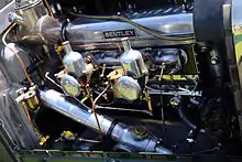 The engine was "resolutely modern"[10] for the time. The displacement was 4,398 cc (268.4 cu in): 100 mm (3.9 in) bore and 140 mm (5.5 in) stroke. Two SU carburetters and dual ignition with Bosch magnetos were fitted. The engine produced 110 hp (82 kW) for the touring model and 130 hp (97 kW) for the racing model. The engine speed was limited to 4,000 rpm.[10][16] A single, crossflow, overhead camshaft actuated four valves per cylinder, inclined at 30 degrees. This was a technically advanced design at a time where most cars used only two valves per cylinder in a side-valve cylinder head.[16][17] The camshaft was driven by bevel gears on a vertical shaft at the front of the engine, as on the 3 Litre engine.[18]