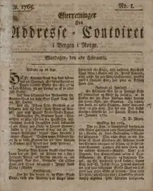 The first issue of Bergens Adressecontoirs Efterretninger, published on 4 February 1765