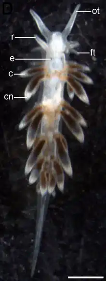 As development proceeds, body elongation increases and more pairs of cerata as well as some tentacle-like elongation of the propodium appears.[6]