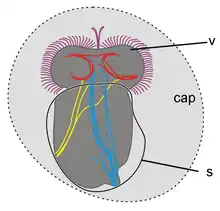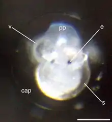 ![]() Dorsal view of veliger stage larva (12% of development). Scale bar is 100 μm. e = eyes, pp = elaborated larval foot (propodium), s = shell, v = ciliated velum, cap = the capsule that surrounds each embryo. |