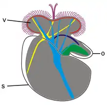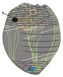![]() Drawing of a dorsal view of an early veliger stage larva (5% of development) showing first fibres of larval muscles: