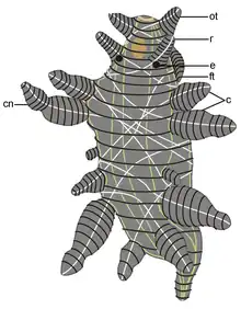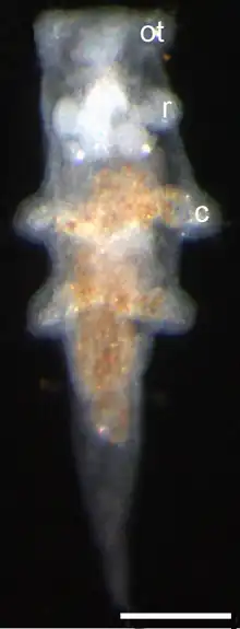 ![]() Dorsal view of 26 days after oviposition (43% of development). Scale bar is 100 μm. ot = oral tentacles, r = rhinophores, c = anlagen of the first cerata. |