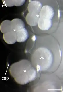 ![]() 1= 2 h after oviposition (0% of development). Scale bar is 100 μm. zy = zygotes, * (asterisk) = four-celled embryos within the same egg mass, cap = the capsule that surrounds each embryo. |