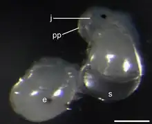 ![]() Dorsal view of an early juvenile stage (30% of development). Scale bar is 100 μm. j = juvenile of Berghia stephanieae is crawling out of the shell and marking the end of the metamorphosis. pp = elaborated larval foot (propodium), e = eyes, s = shell. |