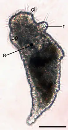 ![]() Lateral view of an early vermiform juvenile stage (35% of development). Scale bar is 100 μm. r = anlage of the rhinophores, cil = cilia. The body is covered by cilia. e = eye, pp = propodium. |