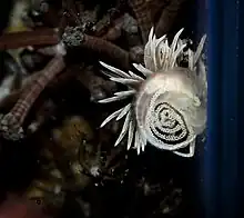 Typically the embryos of nudibranchs are enclosed by two membranes, the capsule that surrounds each embryo and another mucoid layer that encases all of the capsules in a gelatinous egg mass. After oviposition the first cleavages proceed quickly (at 1–2 hours after oviposition two-cell stage (0% of development) and at 8 hours after oviposition 16-cell stage (0.5% of development)). The divisions within an egg mass are asynchronous, both four-celled embryos and zygotes can be detected in the same egg mass.[6] |