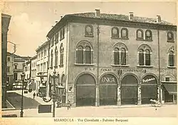 After the unification of Italy, on 27 September 1863 the new Savings Bank of Mirandola was established by royal decree. It was officially opened on 1 January 1864 at the Bergomi palace, next to the town hall. The progressive expansion of business led to the transfer of the bank to the current Art Nouveau palace, built in 1911-1912 in Giacomo Matteotti square.[5]