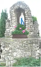 In 1933, villagers under the leadership of Messrs. Rollinger, Bunsen, and Huss built the Muttergottesgrotte (Mother of God Grotto), in the atrium of the church. It was built using many fossilized sea shells collected near Beringen. The impulse to build this grotto may have been inspired by the 1933 canonization of St. Bernadette.[3]