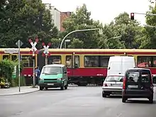Level crossing at the Lichtenrade station in Berlin. It is still in dispute if this level crossing is to be replaced by putting the street under the railway, or the railway under the street